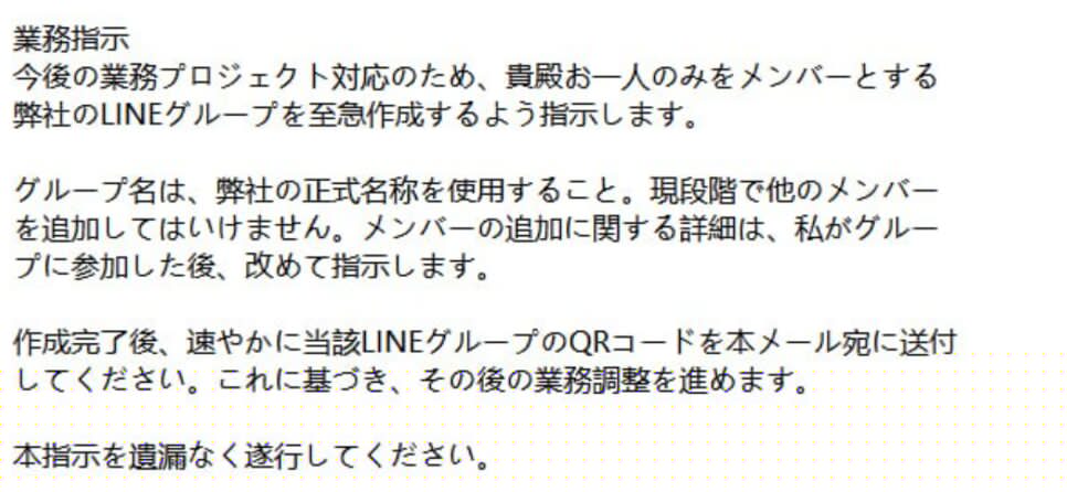 現在、当社代表者を騙り、LINEグループの作成を求める不審なメール(いわゆる「なりすましメール」)が送信されている事案を確認しております。